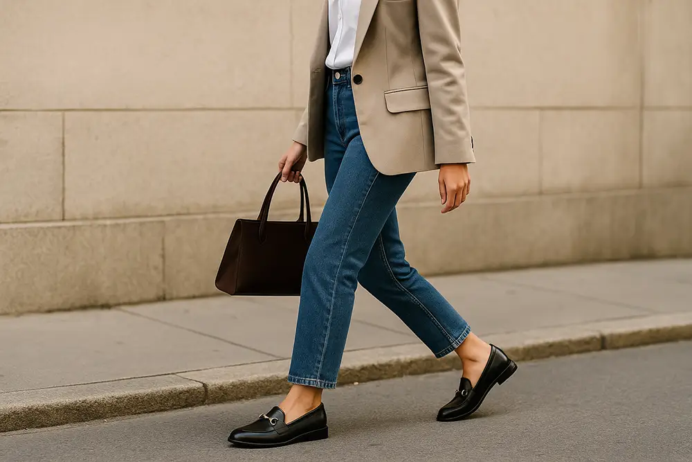 Côté style, le mocassin se prête merveilleusement bien à une esthétique minimaliste, élégante, très “Parisienne”. Portez-le avec un jean droit brut, une chemise blanche parfaitement ajustée, un trench beige ou une veste croisée, et terminez par un rouge à lèvres nude ou framboise : vous obtenez une silhouette moderne, simple, mais très affirmée.